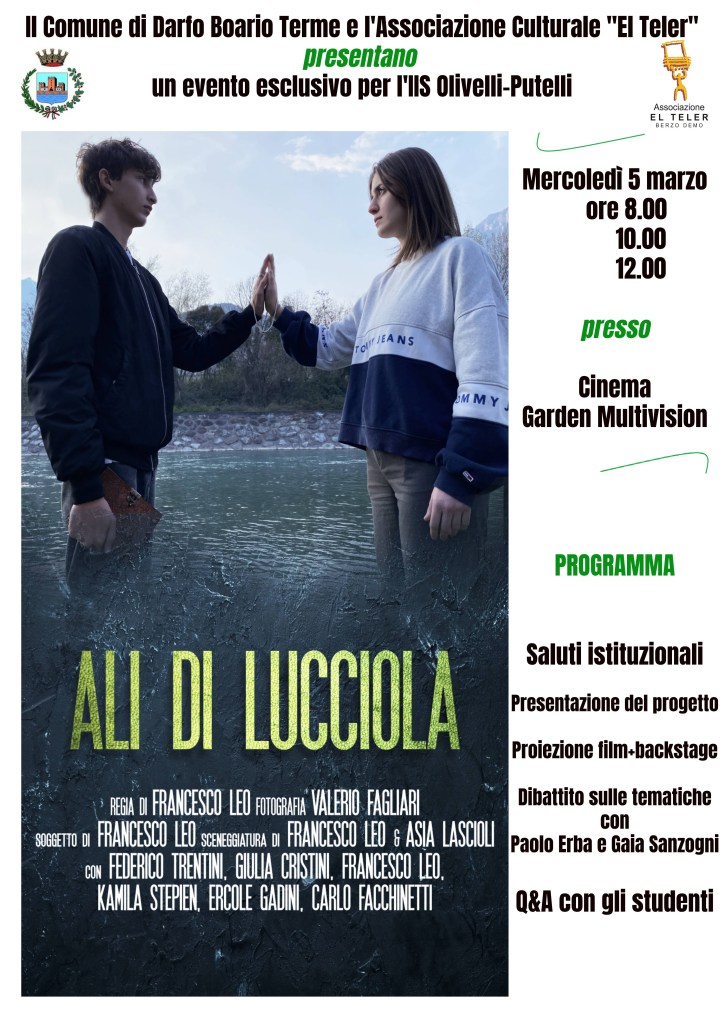 Ieri è stato proiettato presso il Cinema Garden Multivision di Darfo Boario Terme (BS) il mediometraggio Ali di Lucciola, scritto, diretto e interpretato da me e in cui hanno collaborato anche alcuni studenti dell’istituto Olivelli Putelli, in cui lavoro.